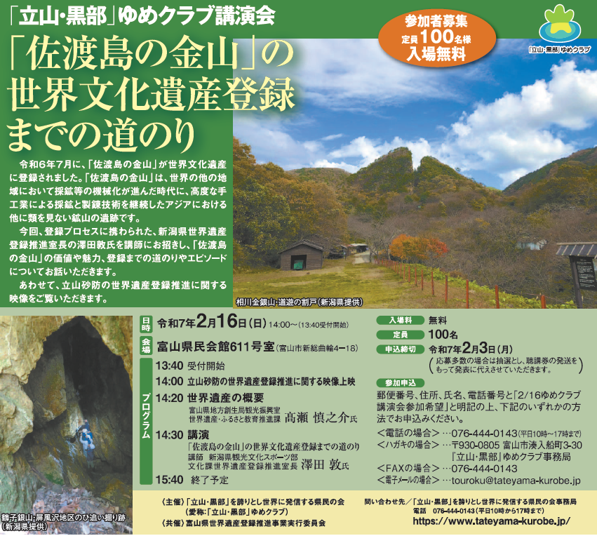 今回は、新潟県世界遺産登録推進室長の澤田敦氏を講師にお招きし、令和6年7月に世界文化遺産に登録された「佐渡島の金山」の価値や魅力、登録までの道のりやエピソードについてお話いただきます。あわせて、立山砂防の世界遺産登録推進に関する映像をご覧いただきます。