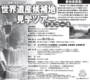 〒939-8214 富山市黒崎445 中部観光株式会社「ゆめクラブ 世界遺産候補地見学ツアー」係